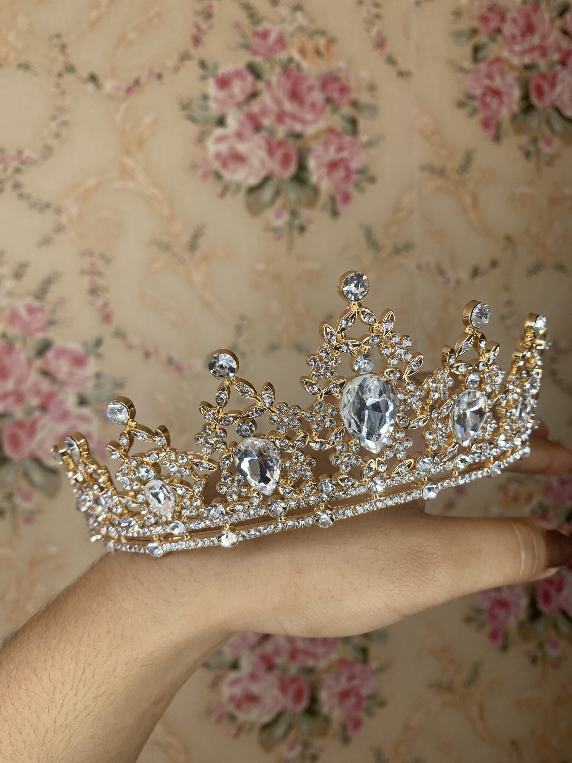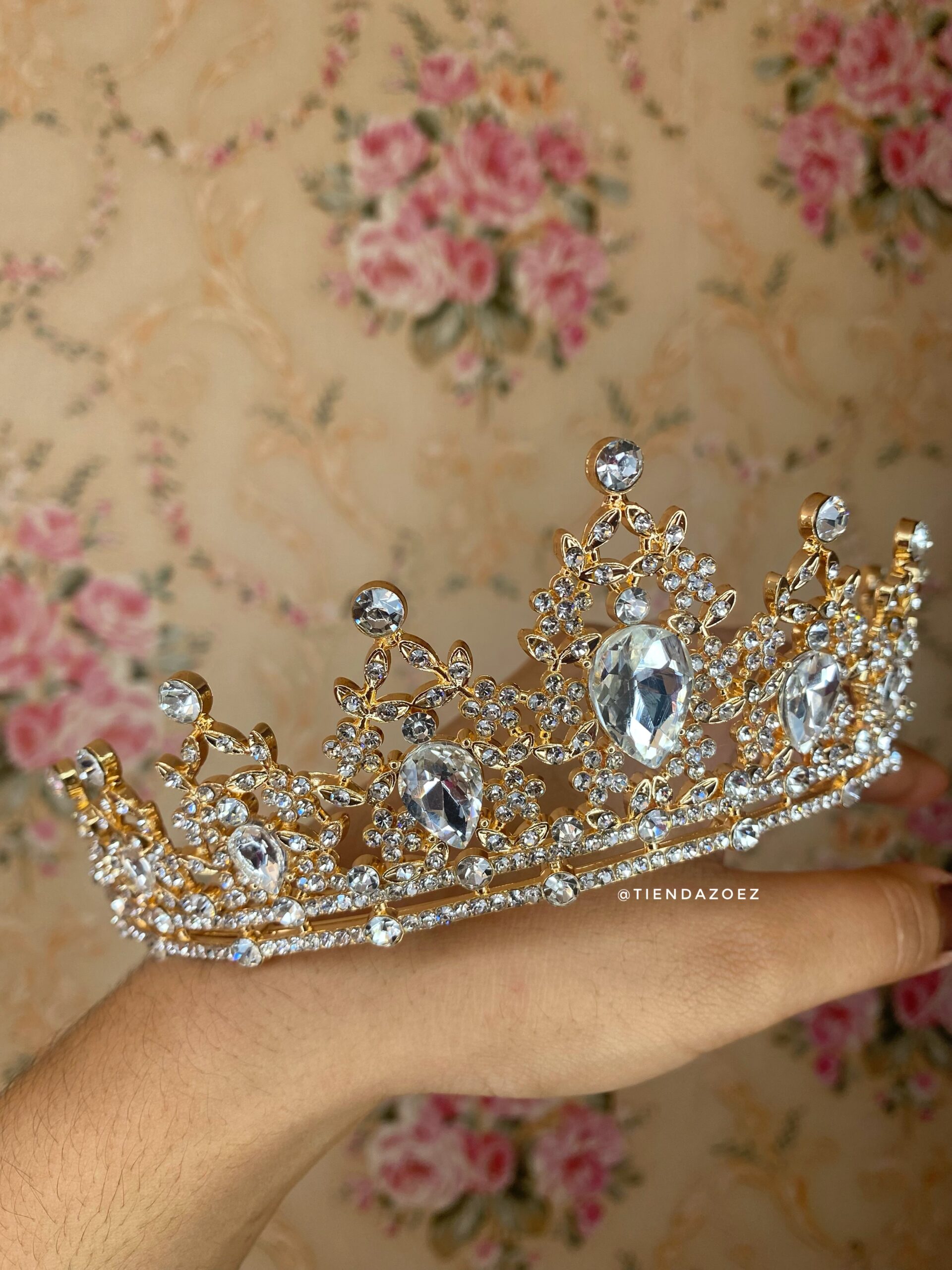 Deslumbra con nuestra tiara dorada con pedreria blanca. Sus tonos s añaden un toque mágico a cualquier ocasión. Ligera y elegante, esta tiara ilumina tu estilo con un resplandor iridiscente