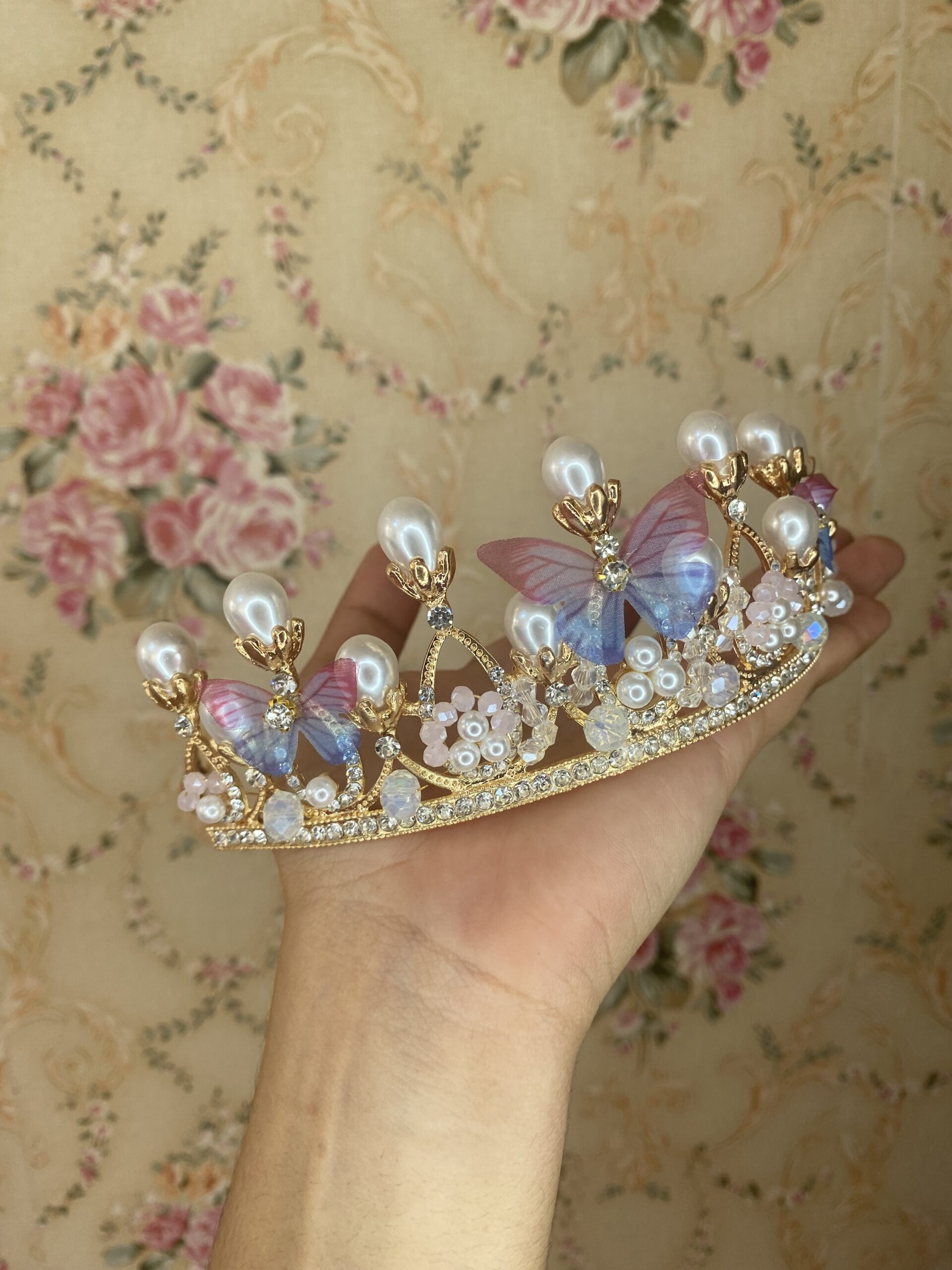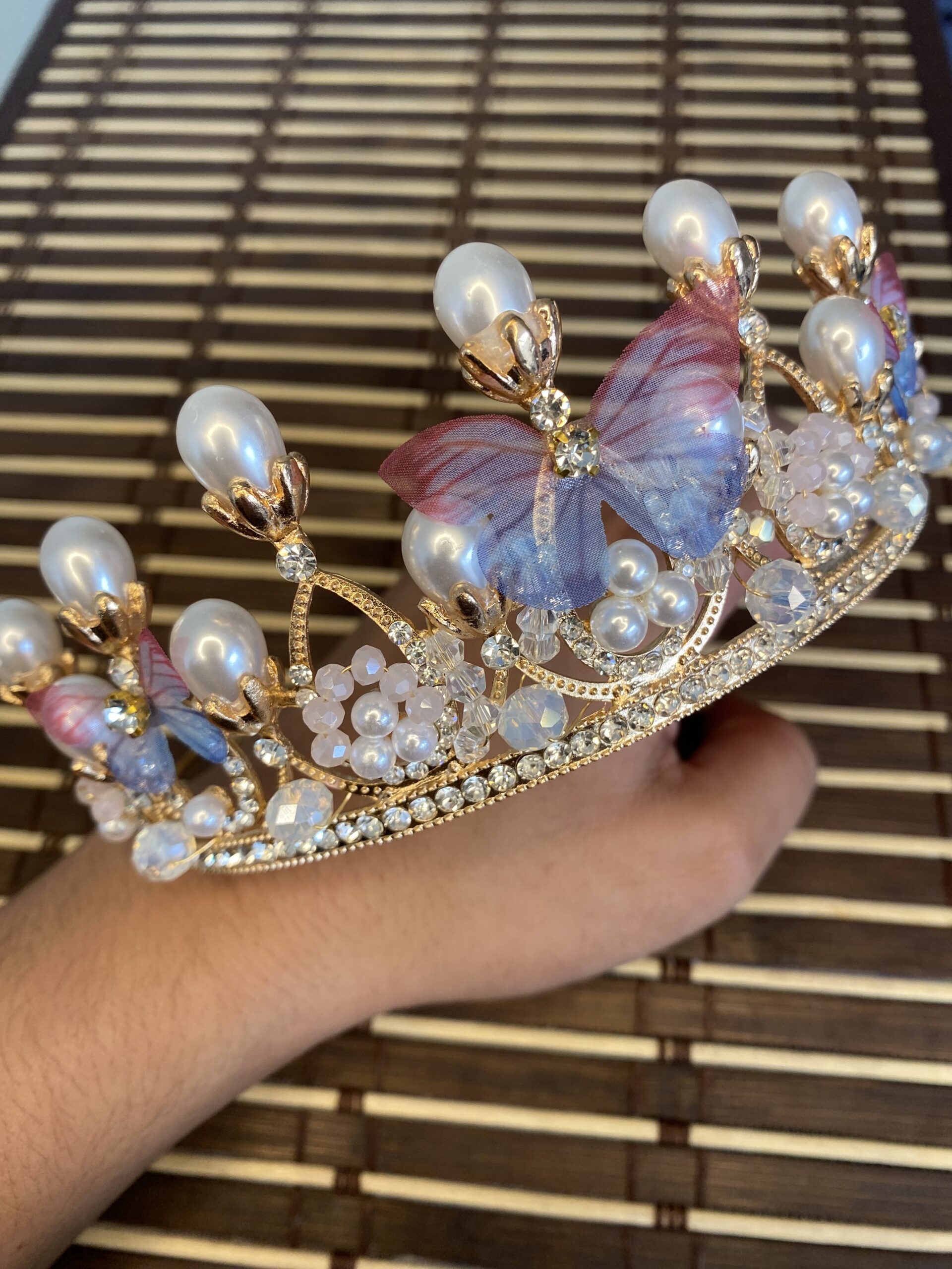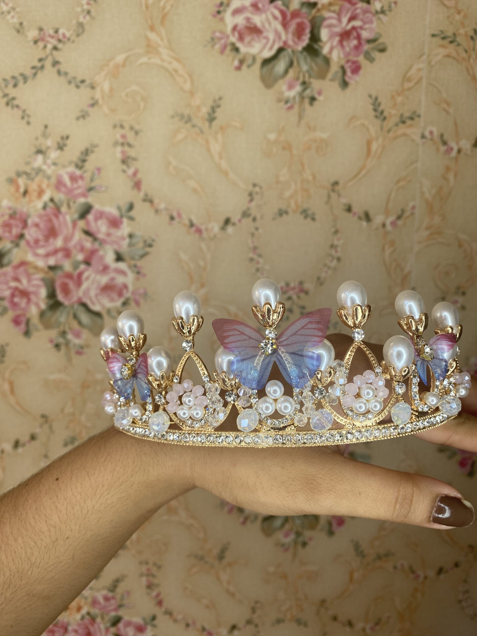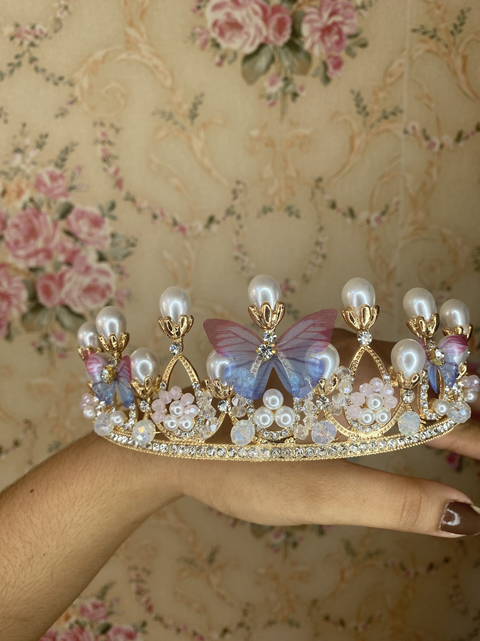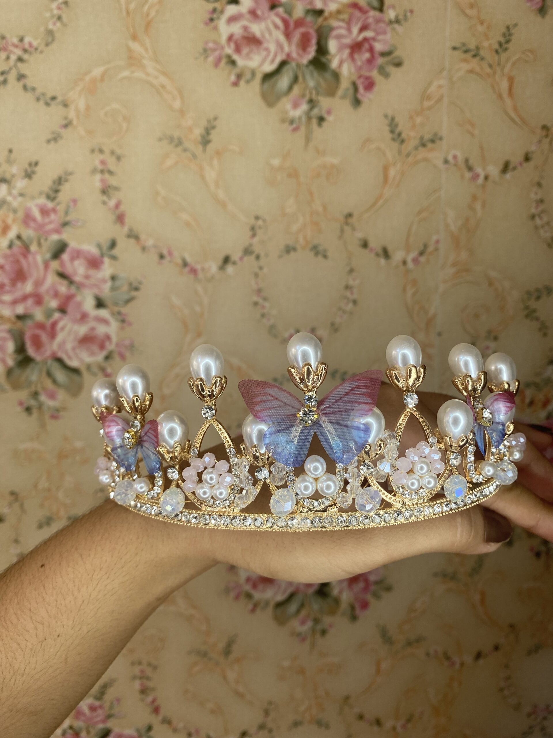 Las pedrerías cuidadosamente colocadas capturan la luz de manera deslumbrante, añadiendo un brillo sutil y sofisticado. Las mariposas, símbolos de transformación y gracia, aportan un toque caprichoso y etéreo, haciendo de esta tiara el complemento perfecto para bodas, eventos especiales o simplemente para sentirte como una princesa en tu día a día.
