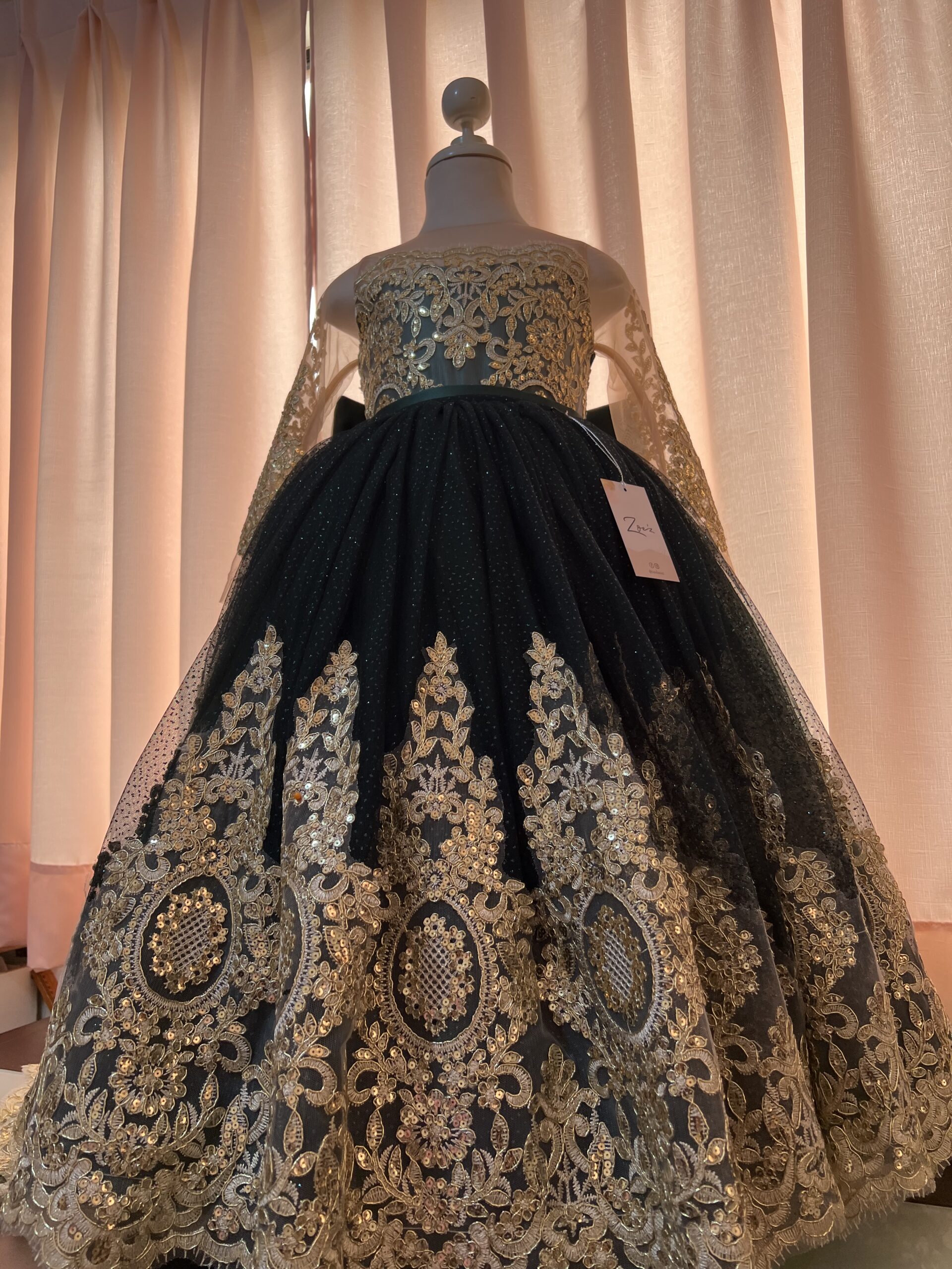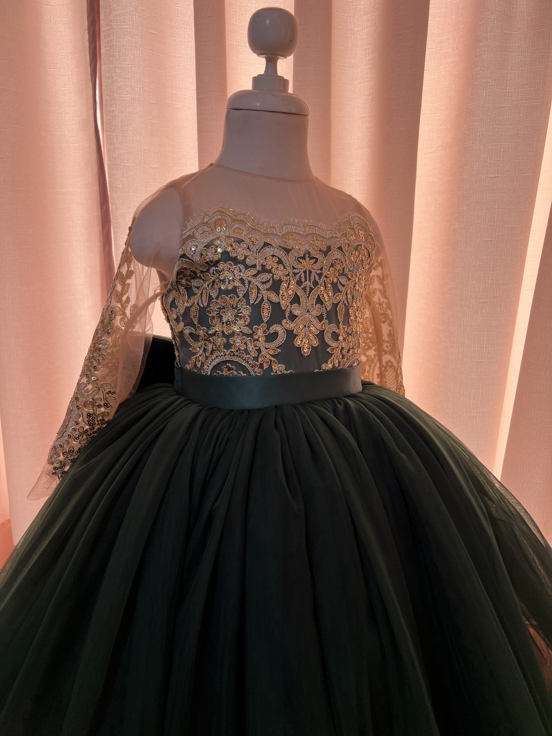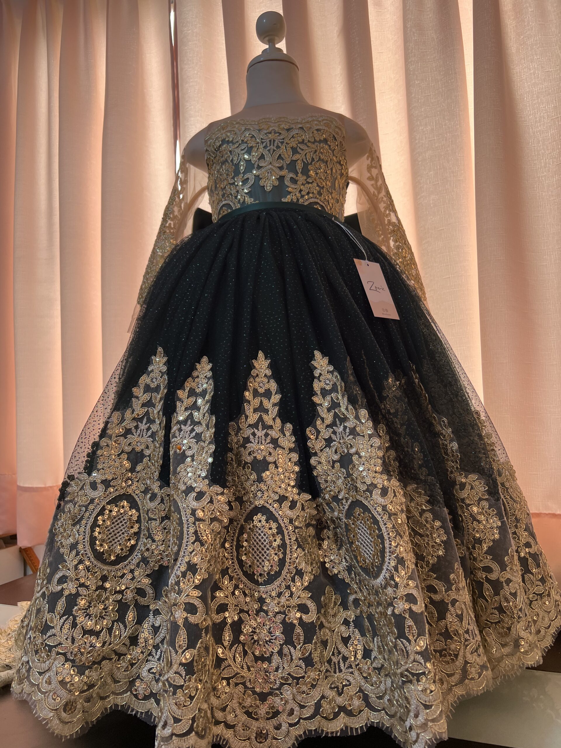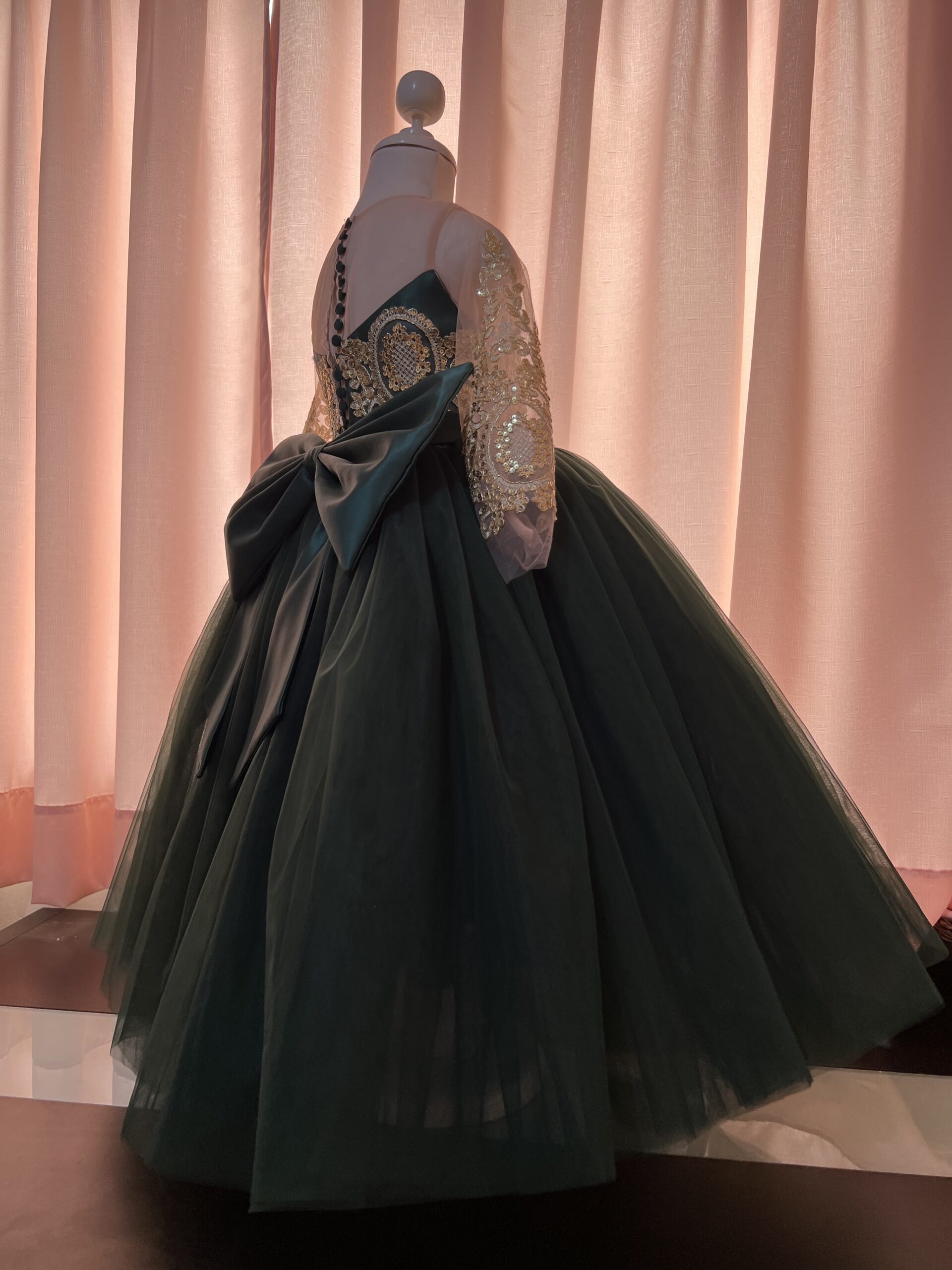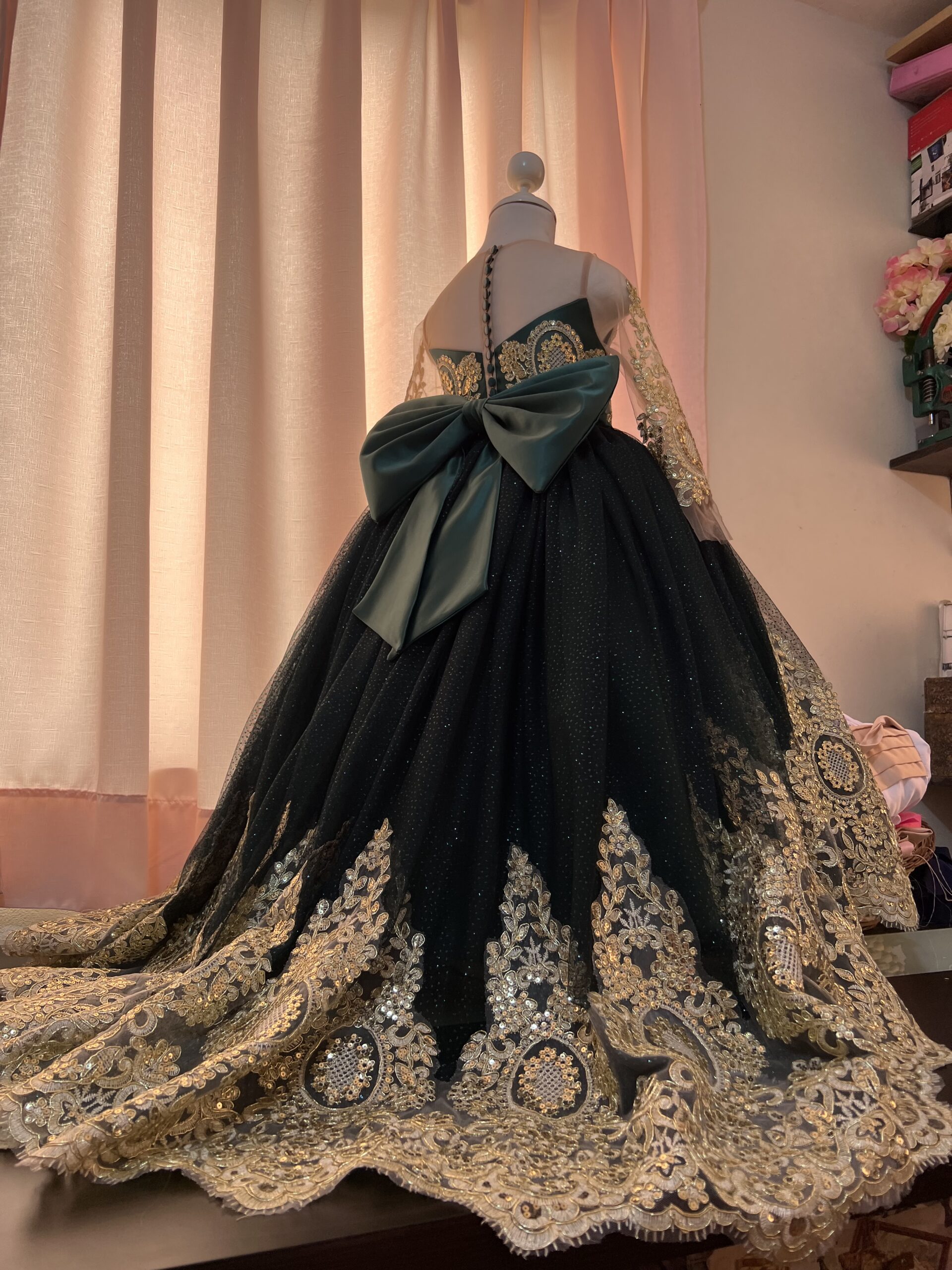 Este deslumbrante vestido de fiesta en color verde oscuro con dorado es la definición de elegancia y versatilidad. La prenda destaca por un exquisito encaje dorado que adorna todo el vestido, añadiendo un toque de sofisticación. La característica distintiva de este vestido es su cola de encaje y tul, que se puede quitar y poner según el deseo de la niña. Cuando la cola se quita, revela un vestido de tul más cómodo, perfecto para disfrutar de la fiesta y los momentos especiales con facilidad.