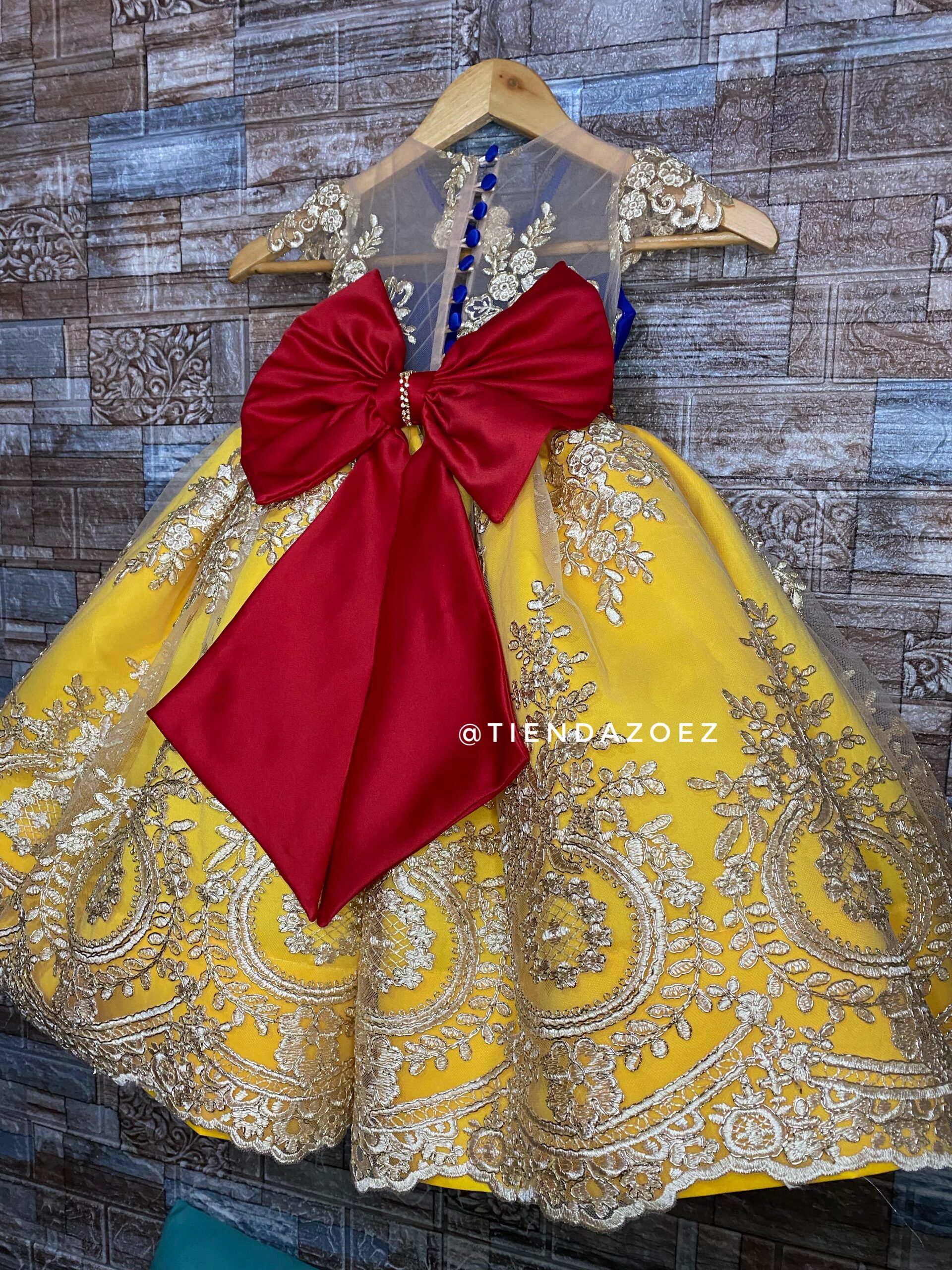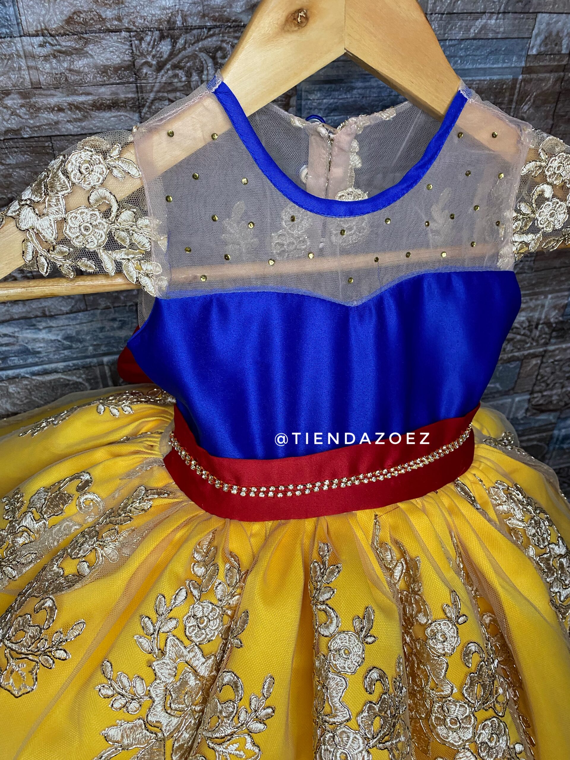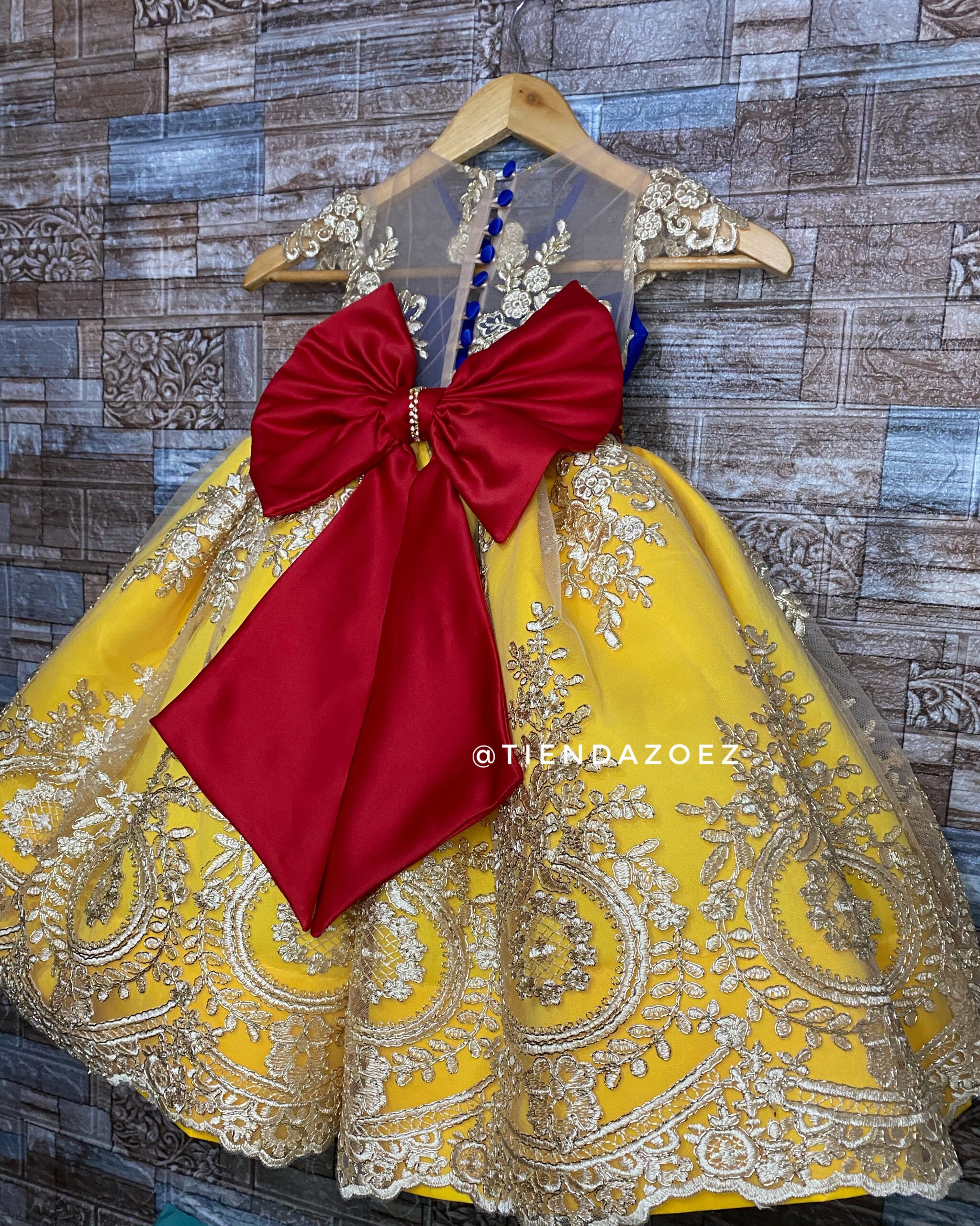 Este encantador vestido para niña, inspirado en la temática de Blanca Nieves, evoca la magia del cuento de hadas con un toque de sofisticación. El diseño destaca por sus detalles de encaje, que añaden un toque romántico y atemporal. La parte superior del vestido presenta un exquisito encaje que aporta delicadeza y elegancia, recordando la pureza asociada con la historia de Blanca Nieves.  La falda, diseñada con fluidez y gracia, complementa la temática con su caída suave. El color elegido refleja la inocencia de la protagonista del cuento, mientras que el encaje realza la belleza de la prenda, haciendo que cada niña que lo lleve se sienta como una princesa.