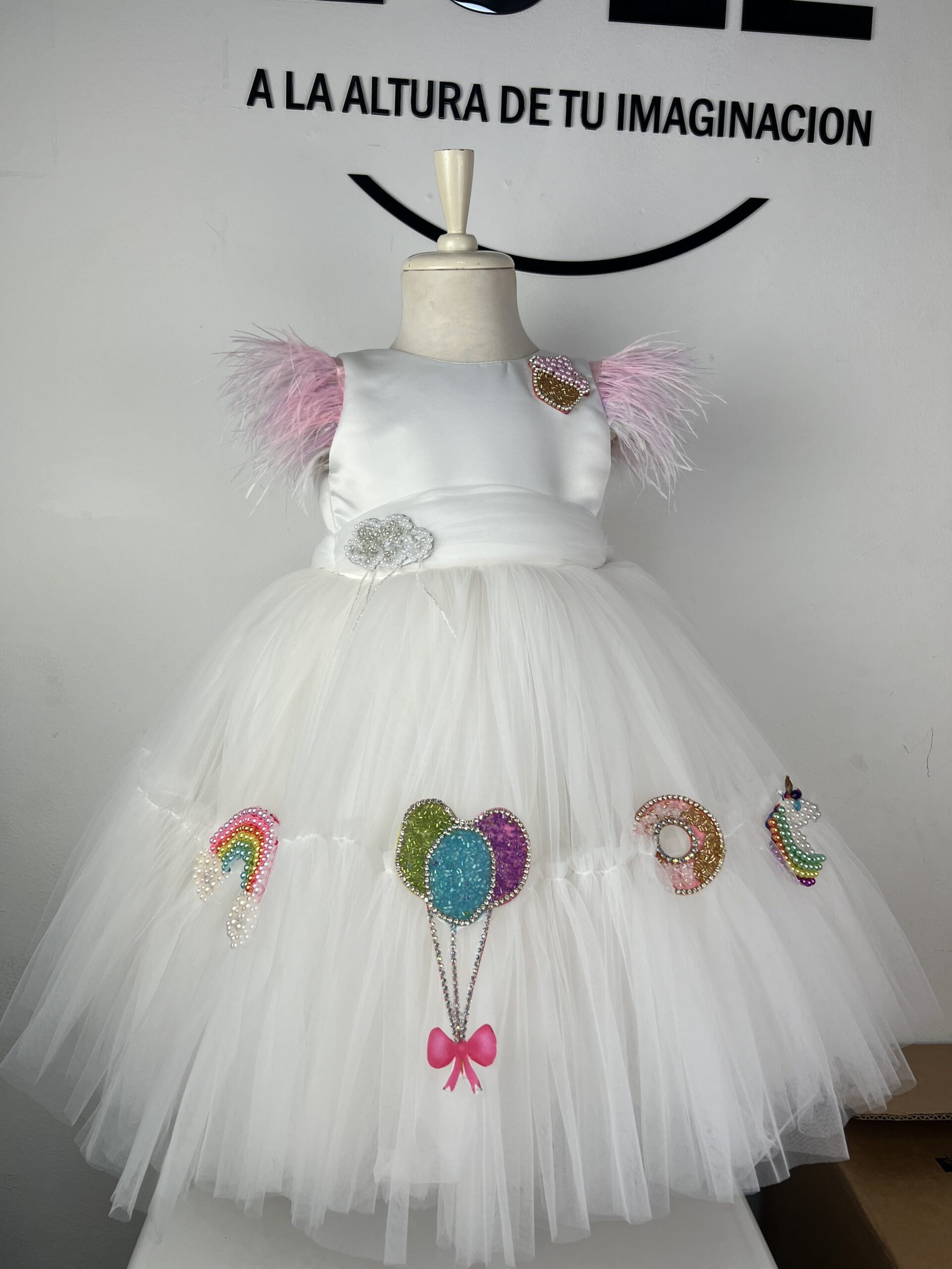 Vestido para niñas en la tematica unicornio con muchos detalles hermosos. Con este vestido inspirado en unicornio, arcoiris, tu pequeña se sentirá como una verdadera princesa.