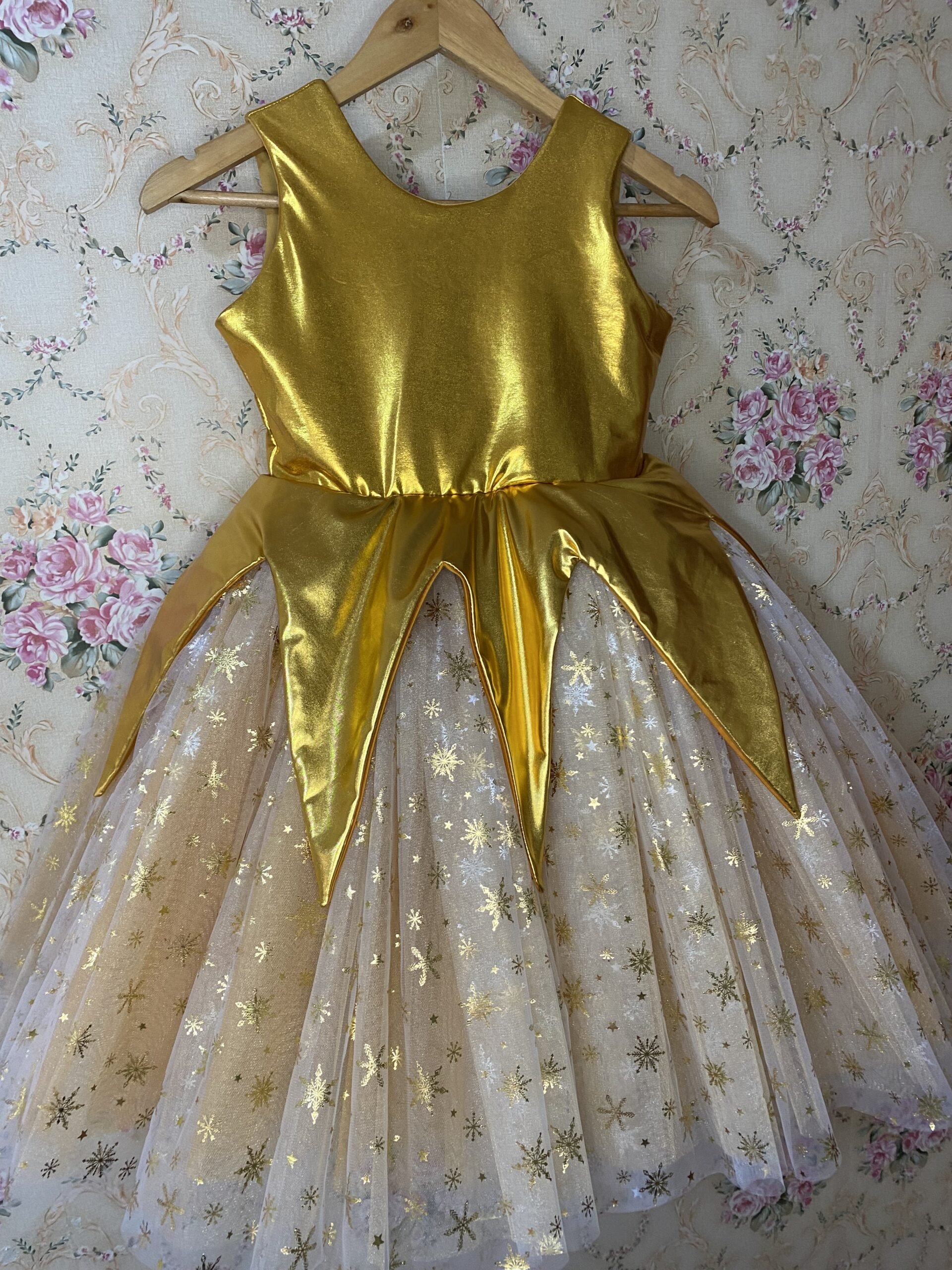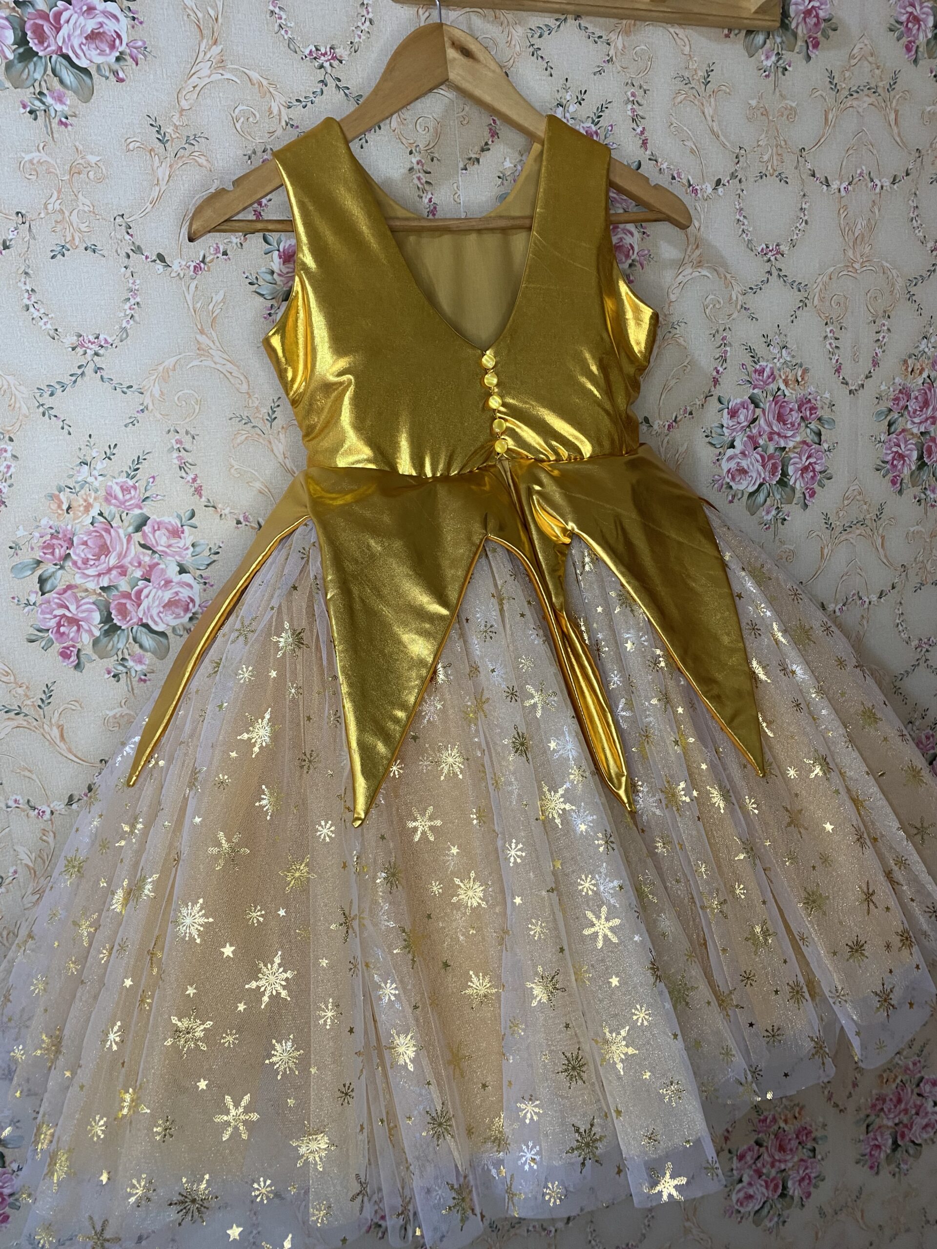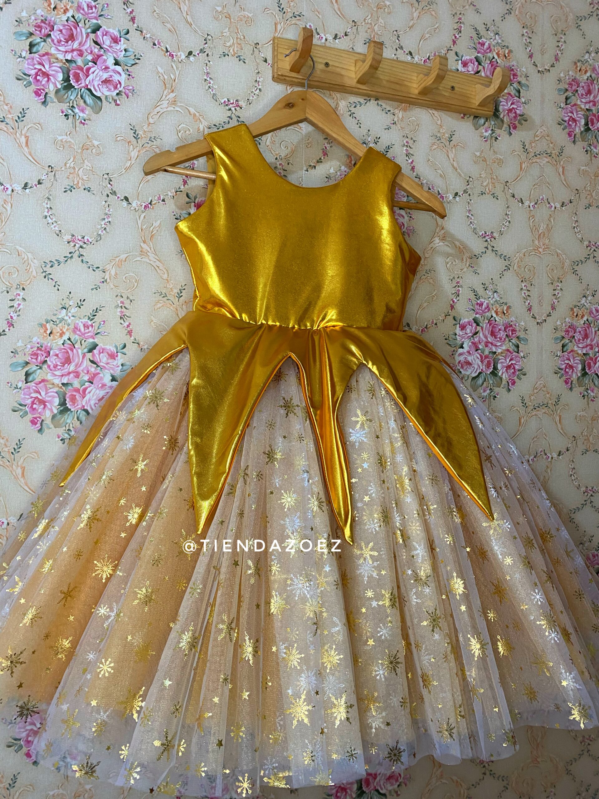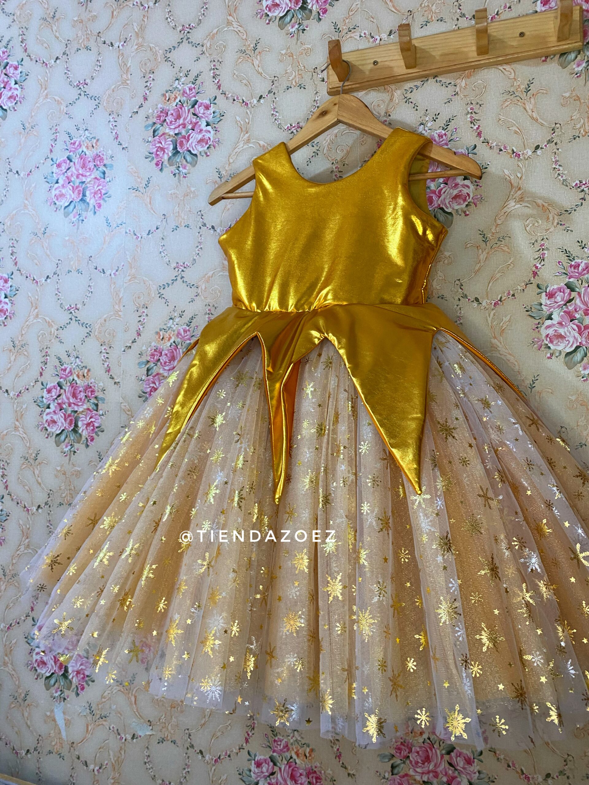 Brilla como una estrella con este encantador vestido de niña en tono amarillo inspirado en el universo de las estrellitas. Confeccionado con delicado tul estampado de estrellas, este vestido captura la magia del cielo. Perfecto para ocasiones especiales o simplemente para hacer brillar su día a día. ¡Deja que tu pequeña luzca radiante y lista para conquistar el mundo con este adorable diseño!